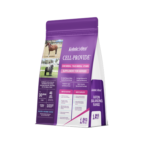 Combining TRIM with Cell-Provide will give the best results because your horse’s ration will be fully balanced and as many horses and ponies with weight problems are on restricted diets that are often deficient or lacking in certain nutrients to help their metabolism to function correctly. TRIM supplements these nutrients in easily absorbable forms for an optimum result. This is particularly important when the horse or pony is fed water soaked hay, which further reduces available nutrients, as well as salts. In these cases, a salt supplement, such as Kohnke’s Own Cell-Salts, in conjunction with TRIM, is also recommended to ensure adequate electrolyte balance for daily needs.